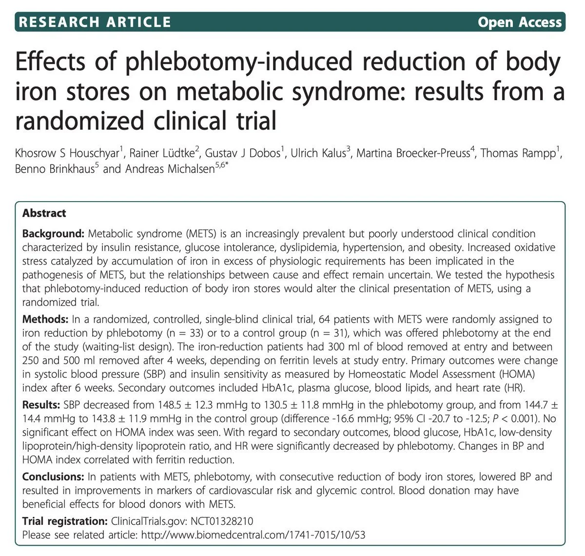 Blood donation improves metabolic syndrome. This study showed donating blood three times improved insulin sensitivity and decreased insulin secretion. Iron accumulation (especially in liver) can drive oxidative stress and inflammation leading to insulin resistance.