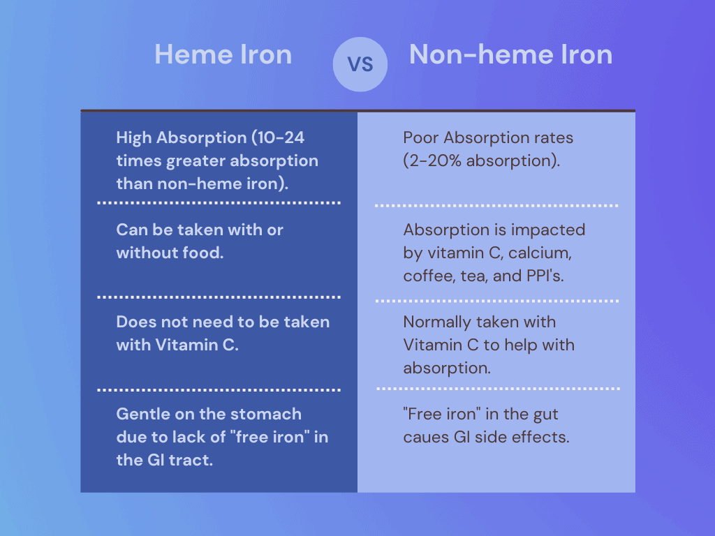 There are two types of dietary iron - heme and non-heme. Heme iron exists in animals and non-heme in plants. The absorption of heme iron is significantly higher than non-heme and should be a focus if you’re diagnosed with anemia. In a addition to heme-iron found in organ and muscle meat, there are high amounts of Folate and B12 which are necessary for the formation of hemoglobin.