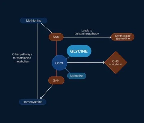 Glycine interacts with the methionine cycle through the enzyme glycine N-methyltransferase (GNMT), which helps clear excess methionine from the body. This process is important because excess methionine can lead to elevated homocysteine levels, which are associated with increased oxidative stress and cardiovascular risk. You can easily test your homocysteine level through Marek. The ideal level is 5-7.2 umol/L. Also interesting is that elevated homocysteine levels correlate with shortened sleep duration.