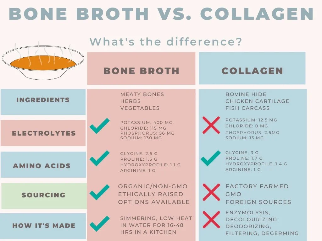 Bone broth contains collagen naturally broken down during slow cooking, making them easily absorbed by the body. Gelatin, derived from cooking collagen-rich animal parts and powdering them, provides a similar amino acid composition and works as a gelling agent for gummies, marshmallows, aspics and other fun things. Collagen powder offers concentrated collagen peptides more easily absorbed than gelatin but lacks the additional nutrients found in bone broth.